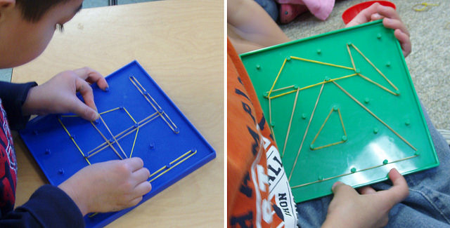 Creating shapes is the best way to learn about them. In lesson 1, the students had fun exploring and creating interesting shapes on their geoboards. This child made a helicopter (left photo). One thing the students learned about in Lesson 2 was triangles. At one point, the children were asked to fill their geoboard with different kinds of triangles (right photo).